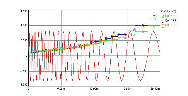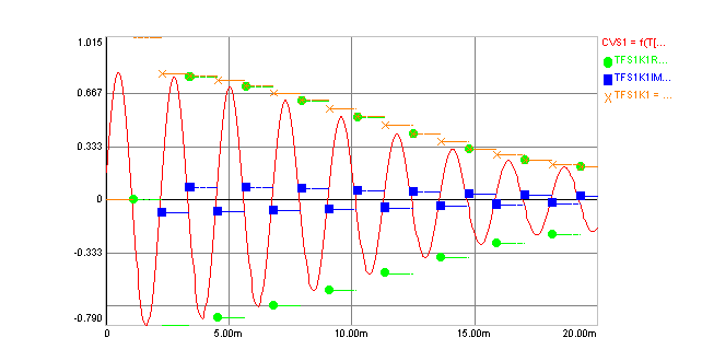 Fig. 1: Dominante Schwingung eines Vokals (rot), Bildung des Merkmalsvektors bestehend aus Real- (grün), Imaginärteil (blau) und Amplitude (gelb) nach jedem Ereignis d.h. nach jeder Halbschwingung
