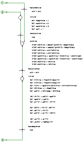 For the design of procedures, facilities and methods of the event driven Time and Frequency Analysis is recommended a prototype. Fig. 3 shows a part from the prototype for the extraction of the features vectors, which one into the fig. 1 and 2 was used. He was note down as state graph complies with the standard Unified Modeling Language version 1.0 [UML 97]: The transitions transStartOver and transGoUnder supervise the signal cvS1 to be analyzed. In the state iniOver the measuring in the upper half vibration is prepared, in the states sumOver executed and in fixOver completed. As mirror functions for the Fourier Transform pretended a Sinus function for miS1K1re and a Cosinus function for miS1K1im. Here will also provide every other explicitly portrayable function of the JTFA [Qian 96] or also Wavelets [Daube 92]. When required, the dimension (is here only complex) of the channel K1 will refines for Wavelets. In the state iniOver an ordinal number for the channel nyK1 = ny can provide. For the allocation of further ordinal numbers nyK2, nyK3, ... , nyKm must be established still corresponding further channels K2, K3, ... , Km (not represented in Fig. 3). It is remarkable, that by the introduced concept the number of the channel in the practical application remains limited on 8 to 32. What to be analyzed in every channel (mirror function, ordinal number, equation with the method etc.) is newly assigning from event to event.